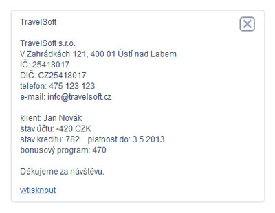 S každým nákupem kreditu se na pokladní doklad tiskne aktuální stav a platnost kreditu klienta. Tento stav lze také vytisknout kdykoliv (např. na vyžádání nebo při odchodu klienta z fitness centra). Od verze 2.5 se pokladní doklady tisknou ve formátu pro pokladní tiskárny, obsahují rozpis DPH.